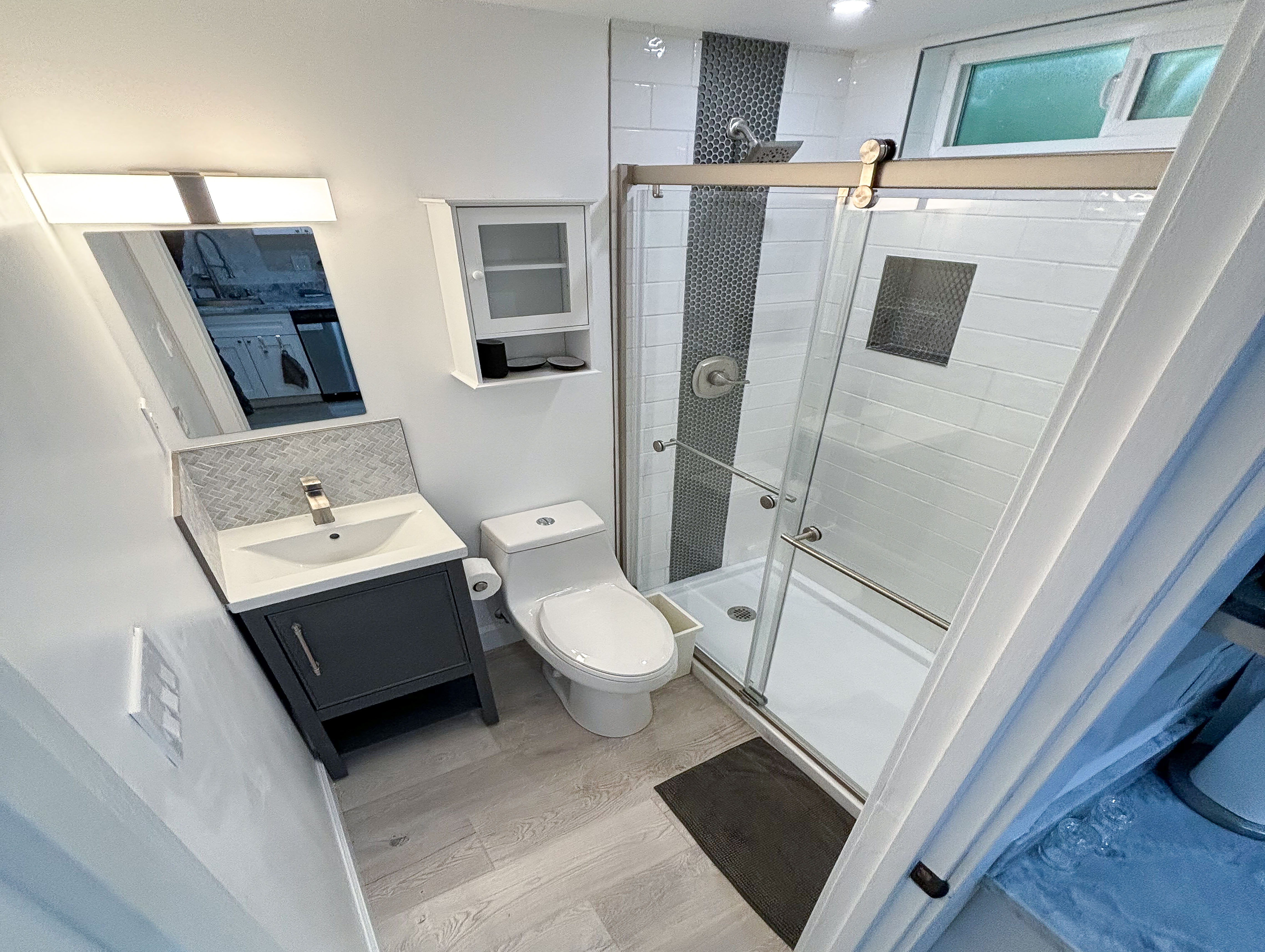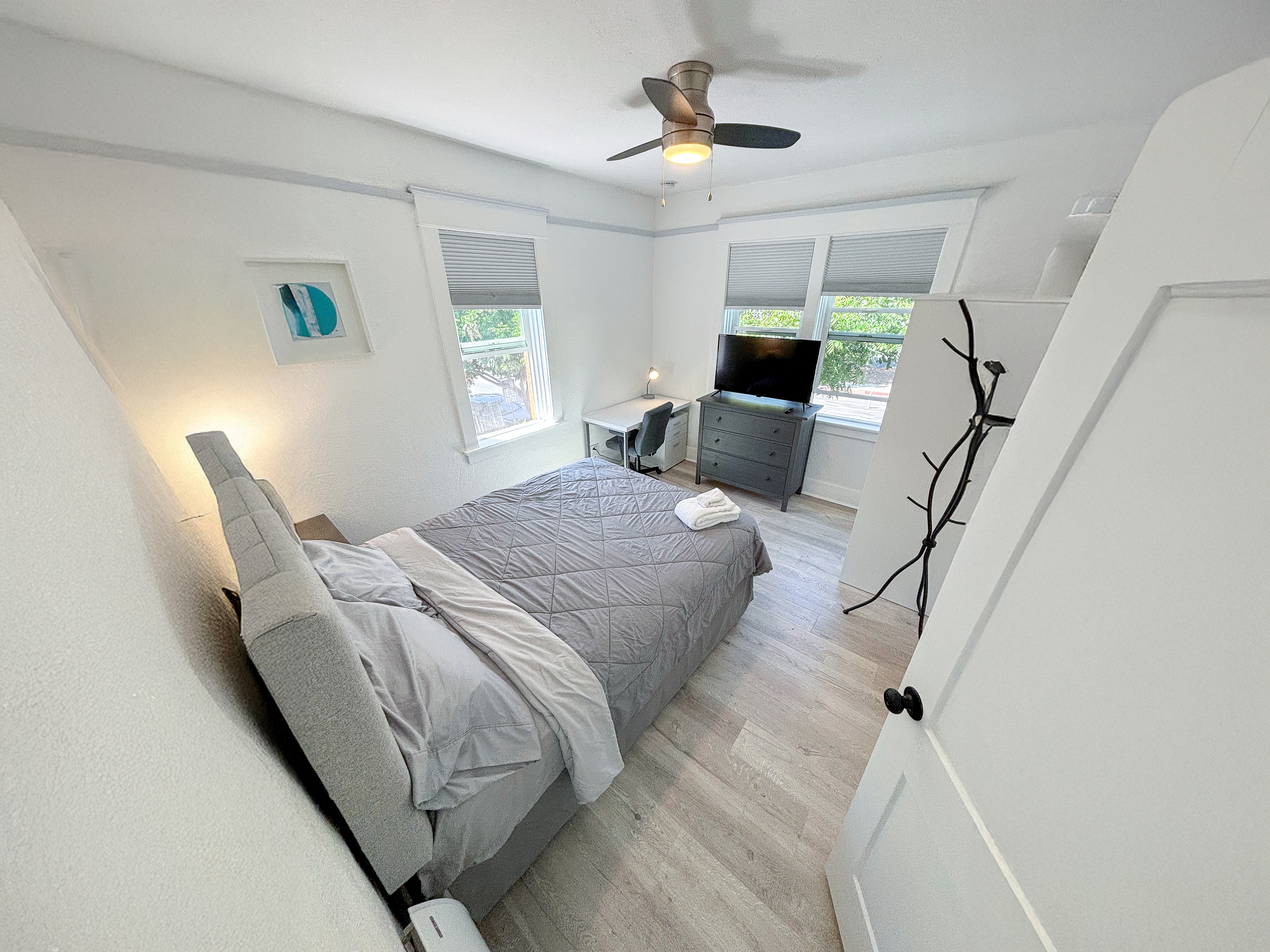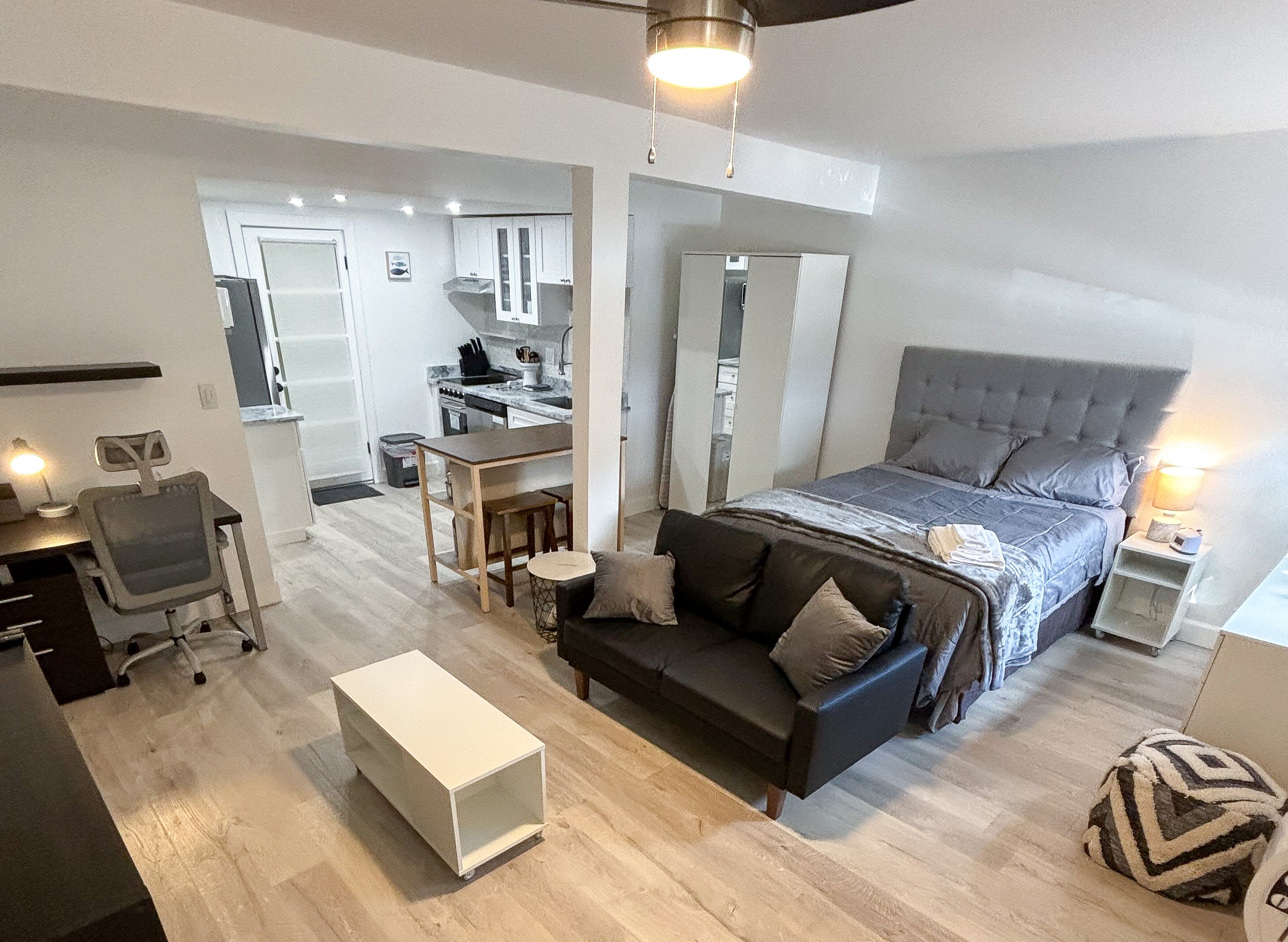 It’s an airy living space with high ceilings, skylights and wood & tile flooring throughout. The apartment has a full kitchen equipped with all appliances, cookware, dishes and a breakfast island bar. This space serves as the main common living area. Bedrooms come complete with everything you need from linens and a desk to streaming wall tv and more.