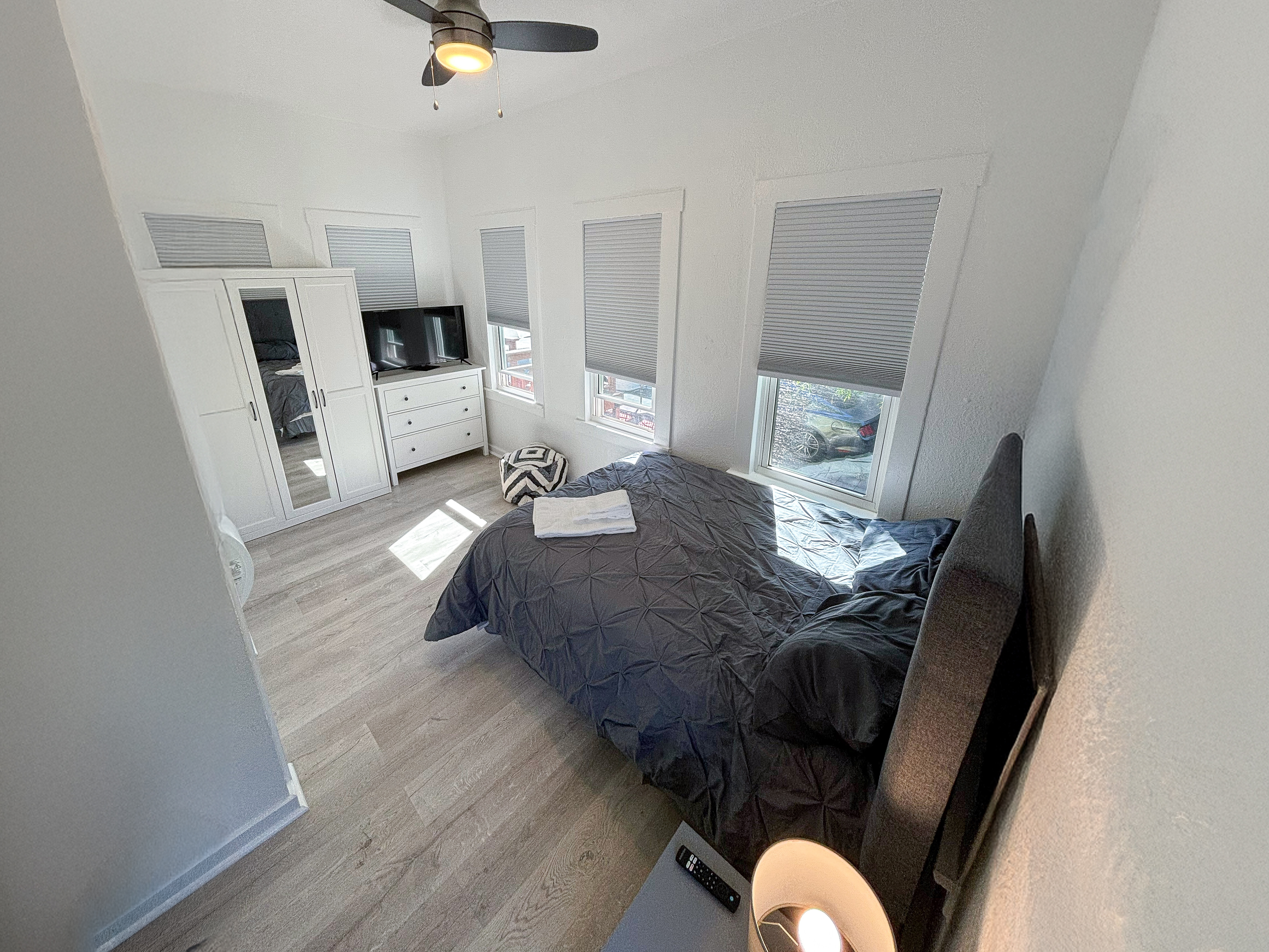 The unit’s floor plan offers full beds in two single occupancy bedrooms with private entrances. 1A and 1B are large spaces with high ceilings and wood & tile flooring throughout giving them a studio-like feel. They each have wardrobe closets and enjoy natural light from multiple windows.They come complete with everything from linens to a sofa, desk, streaming wall tv and more.