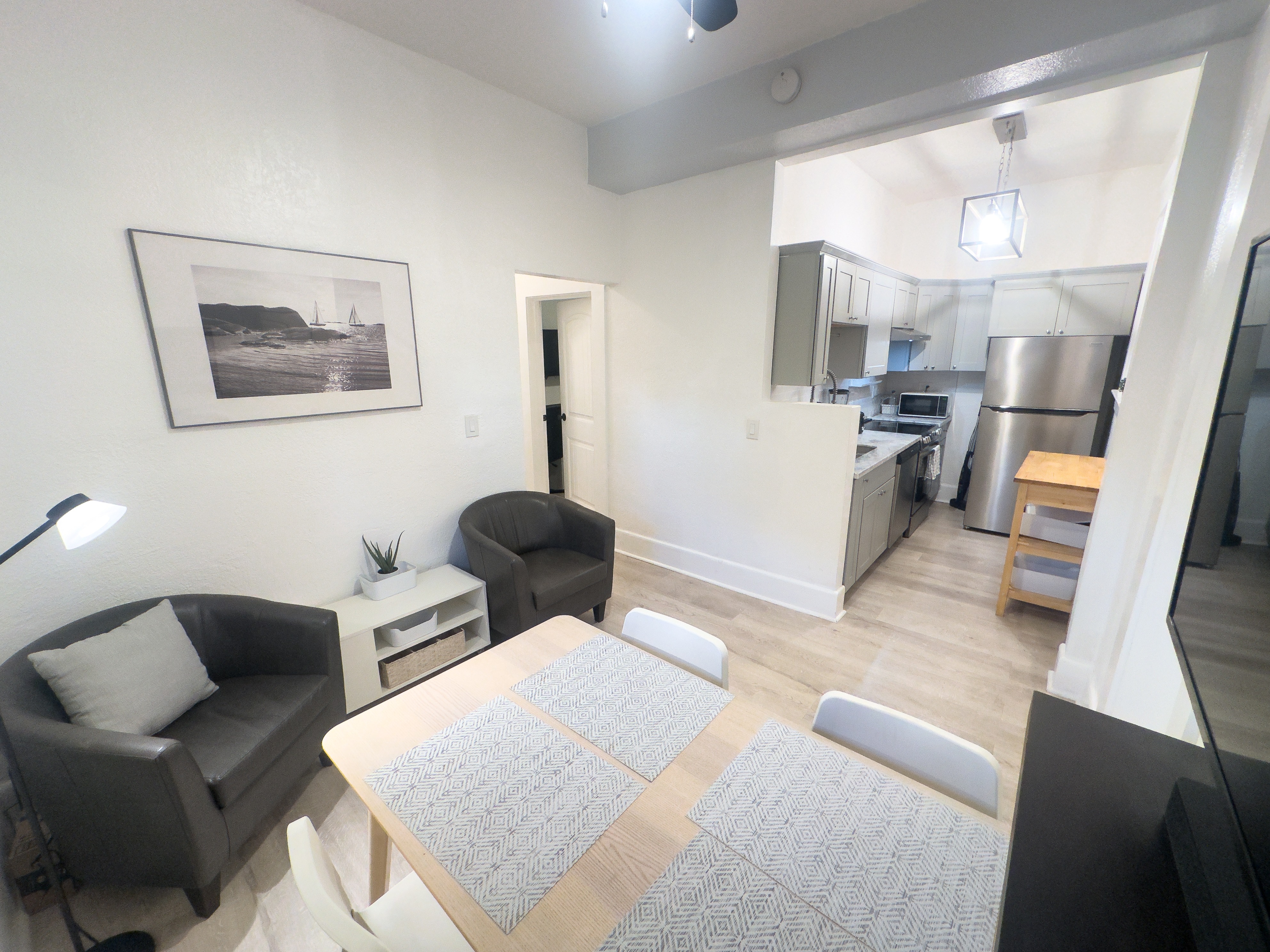 It’s an airy living space with high ceilings and wood & tile flooring throughout. The apartment has separate cooking and eating areas. The full kitchen is equipped with all appliances, cookware and dishes. The living room is complete with everything you need including a dining table set, sofa, streaming wall tv and more. And bedrooms come with everything from linens to a desk.